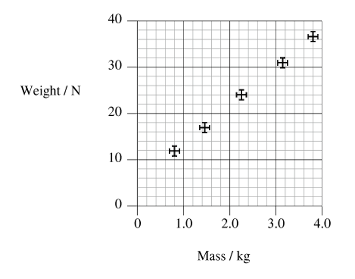 The masses and weights of differe 1 *r.kvp;47 24oorn b;fwbyrq c/yxuf nt objects are independently measured. T xe6l pefr*(,0lpljtqh 4p 35zhe graph is a plot of weight versus mass that includes e lteplq,l r*je3h4xz( p056pfrror bars.  What do these experimental results suggest?