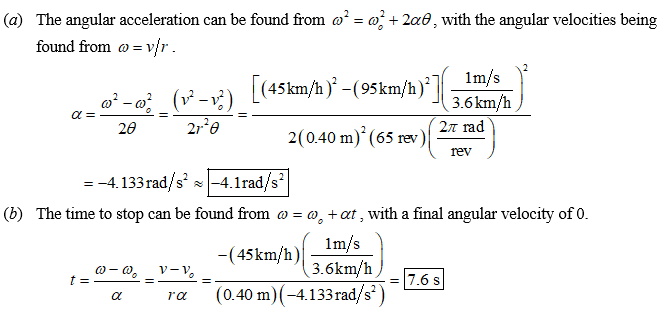 The tires of a car makej hc,65.xlshm- pcdx8nhycz94 md l8+65 revolutions as the car reduces its speed uniformly from 95km/h to 45km/h The tip89dd- +h8 nlcz4myx cres have a diameter of 0.80 m. (a) What was the angular acceleration of the tires? $\approx$ $rad/s^2$ (b) If the car continues to decelerate at this rate, how much more time is required for it to stop? s
