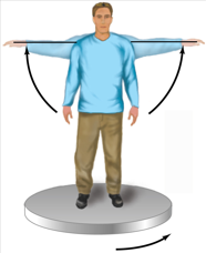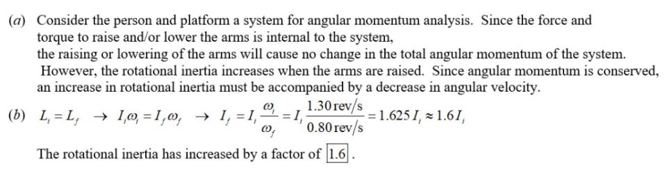 A person stands, hands at his side, ozpkw( a6/lt 6kn a kke)z5e81nnb 9 i mmn8platform that is rotating at a rate of 1.3rev/s If he raises his arms to a horizontal position, Fig. 8–48, the speed of rotation decre) 8 zn9m15 bn8mnekiekases to 0.8 $rev/s$ (a) Why? (b) By what factor has his moment of inertia changed?