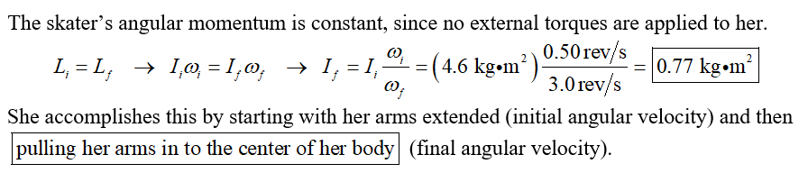 A figure skater can increase her spin rotation rate f + /5f)chcgox -rjedfg-.9 jihrom an initial re l49lylji57 ib,. anjate of 1.0 rev every 2.0le lnji, 4l i5ay7.bj9 s to a final rate of 3 $rev/s$ If her initial moment of inertia was 4.6 kg*$m^2$ what is her final moment of inertia? How does she physically accomplish this change? $kg \cdot m^2$