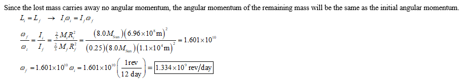 Suppose a star the size of our Sun, but with mass 8.0 hc o sjw5 nrxc(b(),j/times as gre3yunyx 7dk+itfg3 )4g at, were rotating at a speed of 1.0 revolution every 12 days. If it were to undergo gravitational collapse to a neug37ix u4dn)+gy ky f3ttron star of radius 11 km, losing three-quarters of its mass in the process, what would its rotation speed be? Assume that the star is a uniform sphere at all times, and that the lost mass carries off no angular momentum. $\times10^{9 }$ $rev/day$