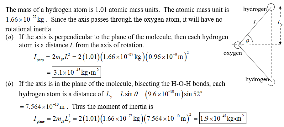 Figure 8–53 illustratsjhoiwe: /dn.vhs 9o(i j- 2u0i t+4oz3cnm gd8tk90s es an $H_2O$ molecule. The O–H bond length is 0.96 nm and the H–O–H bonds make an angle of 104 $^{\circ} $. Calculate the moment of inertia for the $H_2O$ molecule about an axis passing through the center of the oxygen atom (a) perpendicular to the plane of the molecule, $\times10^{-45 }$ $kg \cdot m^2$ (b) in the plane of the molecule, bisecting the H–O–H bonds. $ \times10^{-45 }$ $kg \cdot m^2$